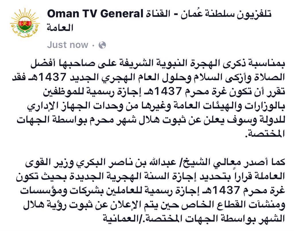 ع مان نيوز Oman News V Twitter غرة محرم إجازة للقطاعين العام والخاص بمناسبة ذكرى الهجرة النبوية الشريفة على صاحبها أفضل الصلاة وأزكى السلام Http T Co Eljx6v4t79