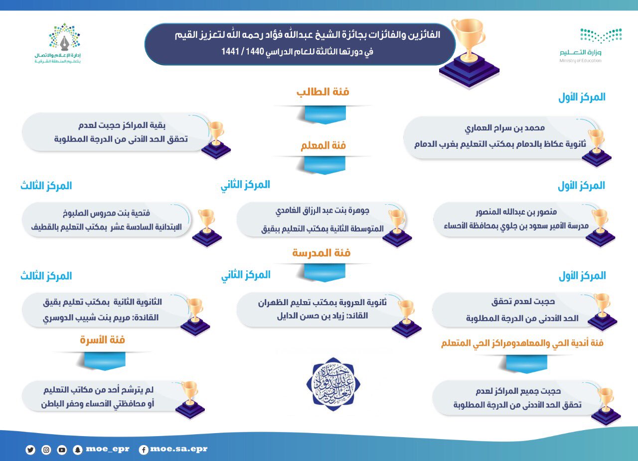 إدارة تعليم الأحساء On Twitter تهنئة للفائزين بجائزة الشيخ عبدالله فؤاد رحمه الله لتعزيز القيم في دورتها الثالثة للعام الدراسي 1441هـ وزارة التعليم تعليم الأحساء الأحساء Https T Co Vmtt7pvi0k